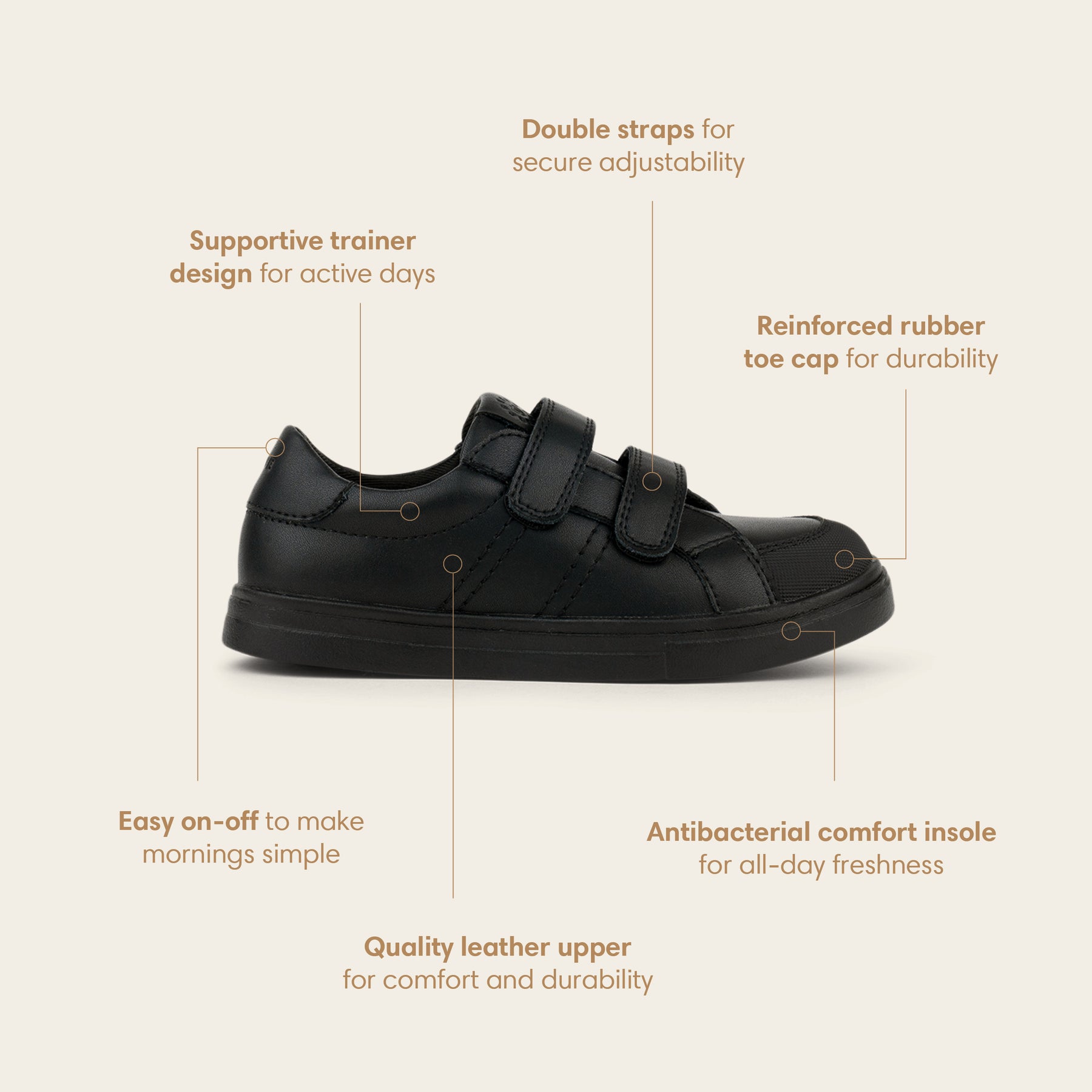 Unbeatable for movement, comfort and durability, Pretty Brave Atlas leads the way as an all-purpose trainer. Featuring double hook and loop straps for easy on-off and a reinforced rubber toe cap for extra protection, Atlas is built to keep up with active kids from classroom to playground and beyond.